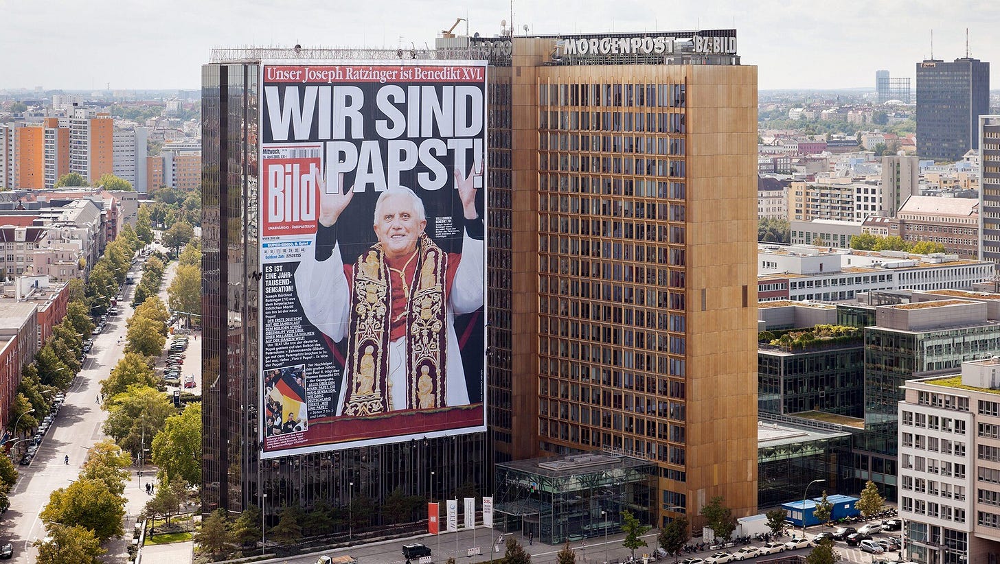 On April 19, 2005, the white smoke gushed from the chimney of the Sistine Chapel. From the Vatican it was announced, “Habemus papam!” We have a pope! This particular Holy Father, then-Cardinal Joseph Ratzinger, would take the papal name of Benedict XVI and become the first German pope since Stephen IX in 1057. Having a German selected to lead the world's largest and most influential church in 2005 proved to be more than a religious symbol. It was a secular one, one of German pride. The political commentary on how the newly minted Teutonic pope abounded throughout the spring and summer of 2005. Perhaps the quintessential example was found in the newspaper Bild, a newspaper perhaps best known gossip and its Seite-1-Mädchen, Page-1 topless girls. From 1984 until 2012, the paper featured topless women. But, on April 20, 2005, the paper featured nothing for prurient purposes. Instead, it proclaimed, “Wir sind Papst!” — We are Pope! Ironically, on Hitler’s birthday, this paper announced to the world that Germans and Germany was pope.